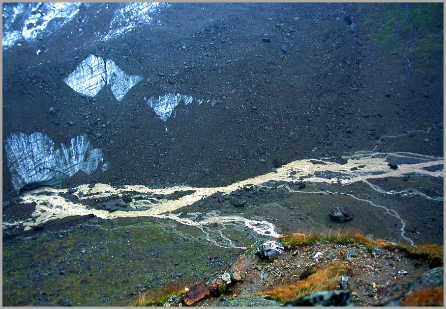 like on a tree); also left: the stream disappears under the huge sheet of glacier ice