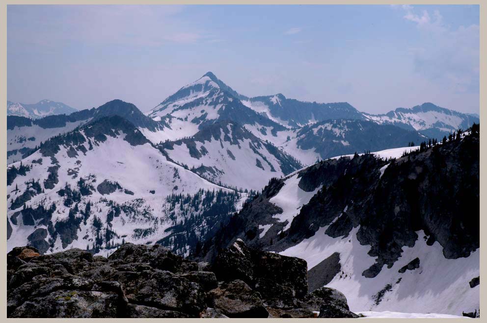 Center of the Wallowas, 4th of July, view west from above Horton Pass (with smoky haze